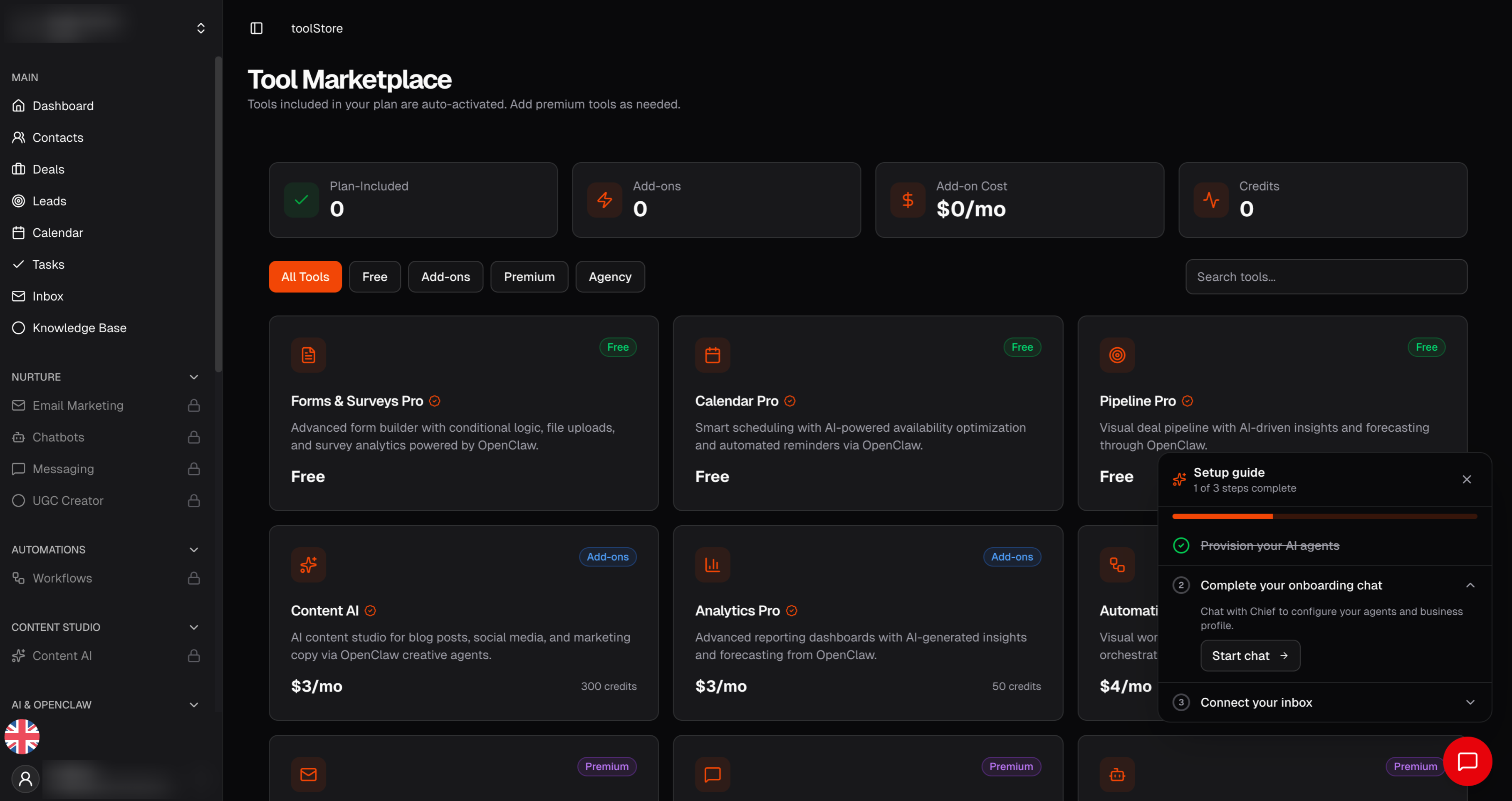Their AI agent, OpenClaw (they call it "Chief"), responds to website visitors through the chat widget, creates and closes support tickets, handles my email, builds out customer records and leads, drops them into a pipeline, and actually progresses deals through the funnel. I'm not exaggerating — it does this on its own. I wake up to messages from Chief telling me what happened overnight and what needs my attention.